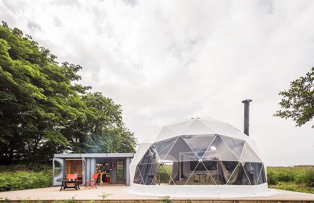 Pour la formule GLAMPING, possibilité de prendre le cocoon nu (membrane et structure) ou d'ajouter les options (isolations 4 saisons, skyview, ventilation, poêle à bois) et/ou les modules (salle de bains, cuisine, chambre, mezzanine).