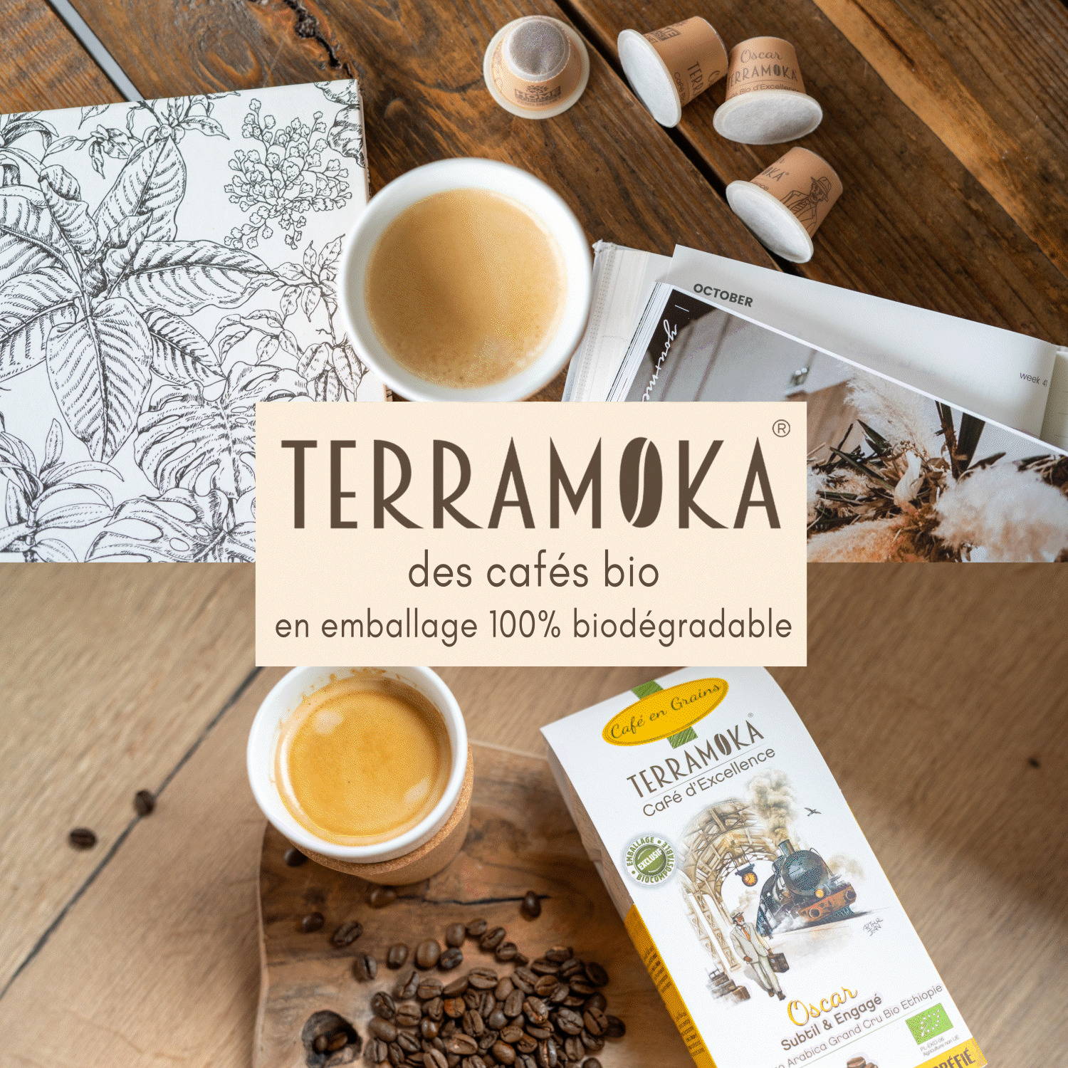TERRAMOKA est une marque française de cafés bio éthique et responsable. Forts de nos valeurs, nous proposons une offre de cafés exclusivement BIO, sélectionnés avec soin parmi de petits producteurs, torréfiés en France artisanalement et emballés dans des étuis écoconçus. Nous avons élaboré une collection de 8 saveurs pures origines 100 % pur arabica en capsules HOME COMPOSTABLES, compatibles Nespresso et certifiées « zéro impact ». Notre gamme se décline également en cafés en grains, moulus, dosettes souples, en emballage kraft sans aluminium.